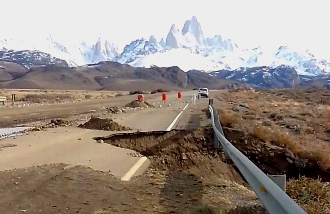 Más de tres años han pasado, y la Ruta Provincial N°41 sigue dañada peligrosamente en su estructura, a pocos kilómetros de El Chaltén. El tramo entre la estancia La Quinta y el acceso al cañadón del río De las Vueltas, la cinta asfáltica está cayendo, como se aprecia en las imágenes compartidas por vecinos de El Chaltén.